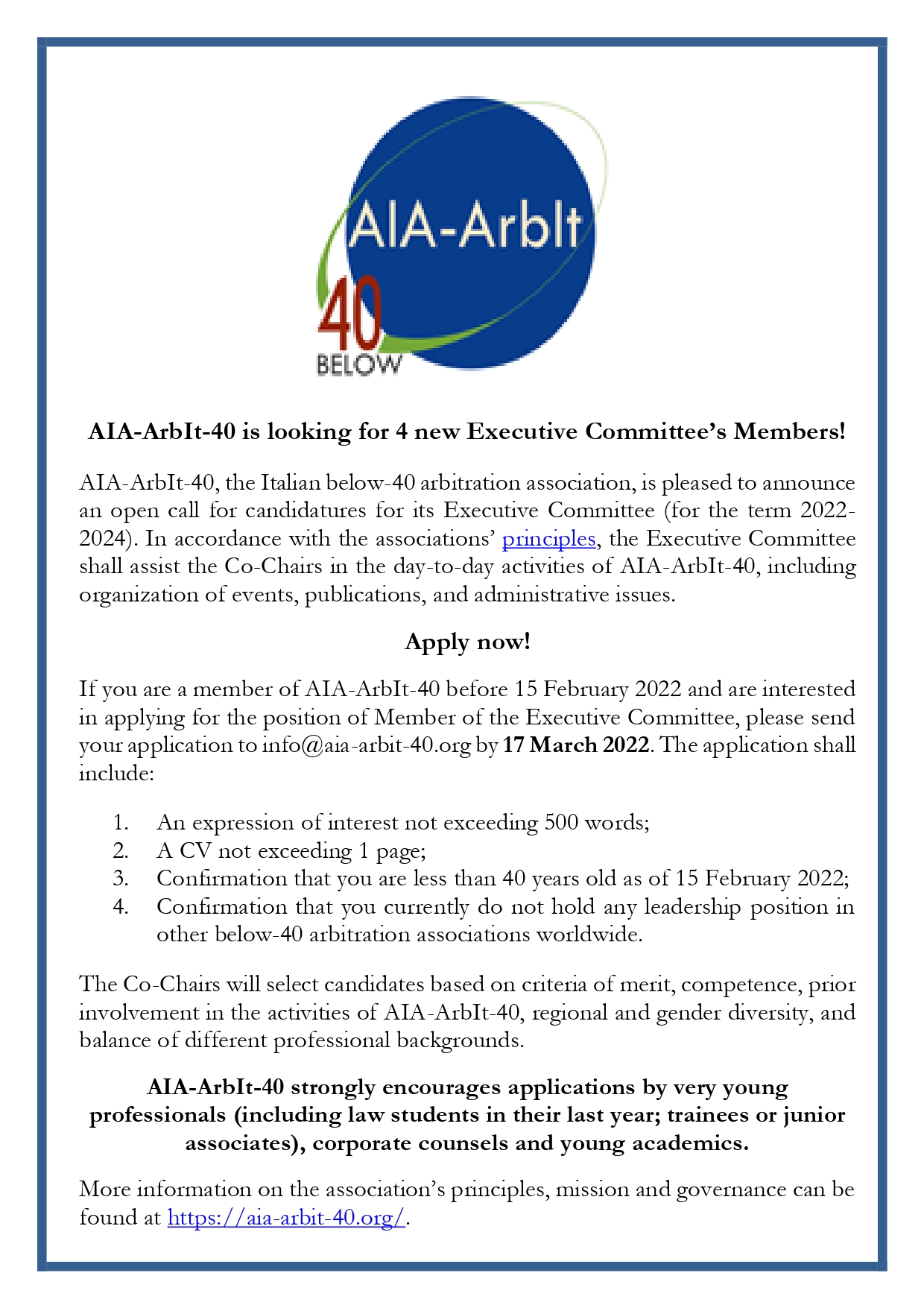 If you are a member of AIA-ArbIt-40 before 15 February 2022 and are interested in applying for the position of Member of the Executive Committee, please send your application to info@aia-arbit-40.org by 17 March 2022. The application shall include: