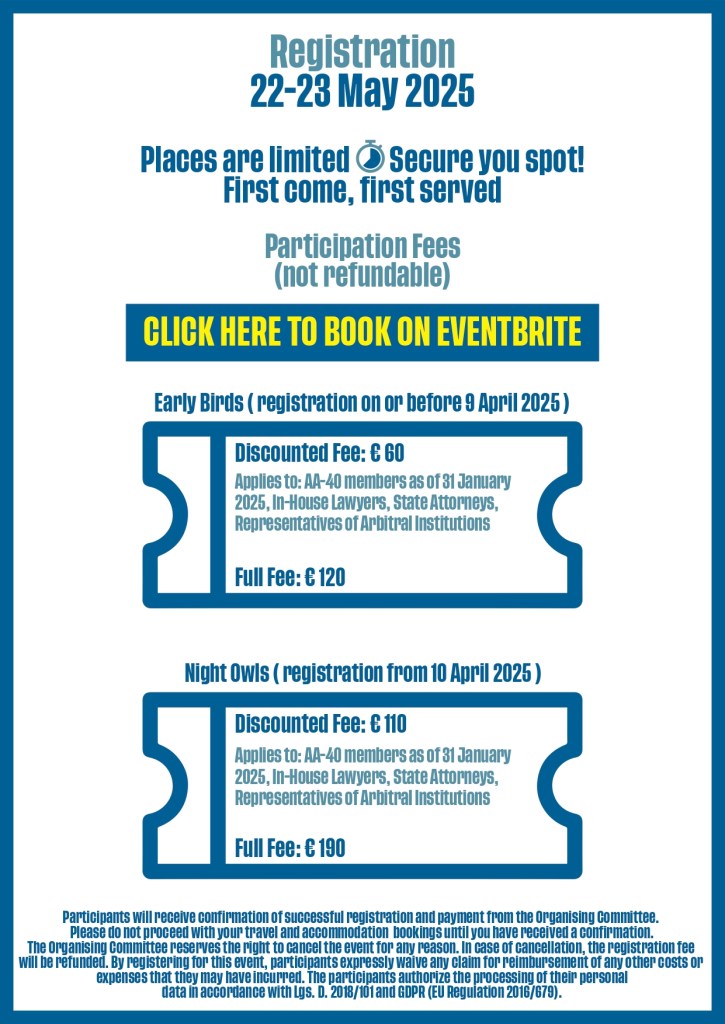 – Discounted fee (€110): AA40 Members (as of January 31, 2025), In-House Lawyers, State Attorneys, Representatives of Arbitral Institutions;