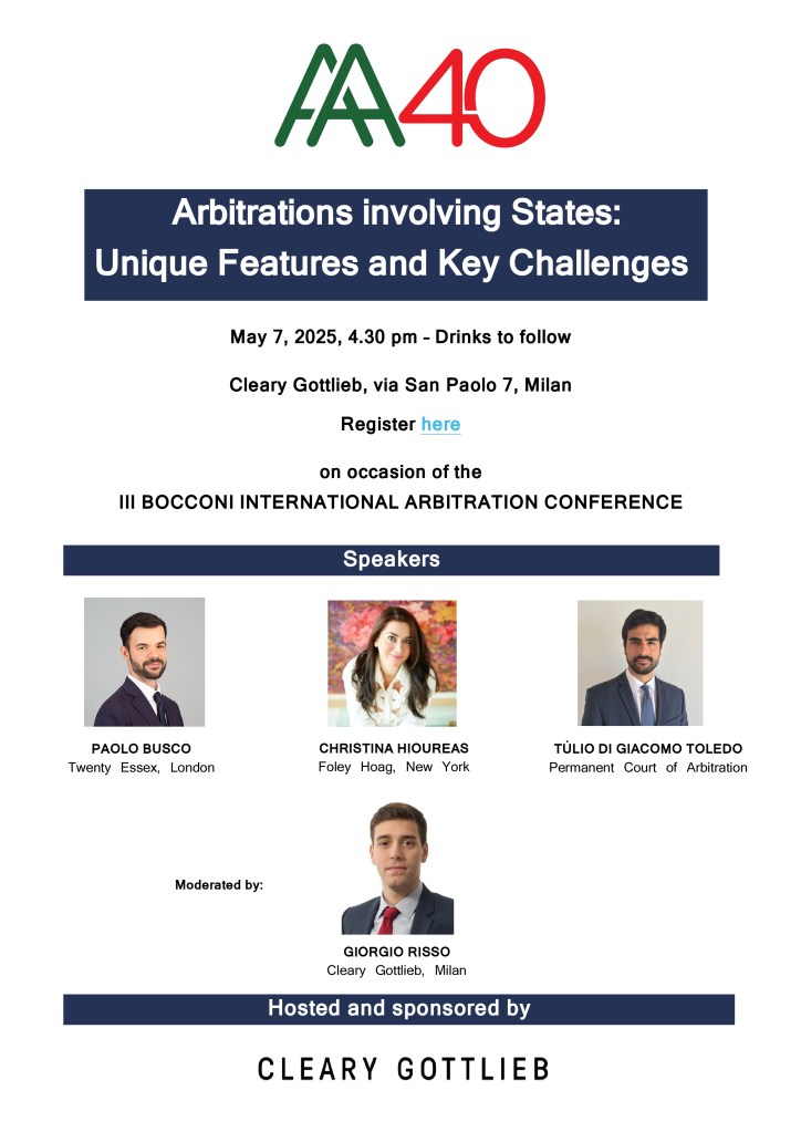 We are delighted to invite you to “Arbitrations involving States: Unique Features and Key Challenges”, the only official side event of the 3rd Bocconi International Arbitration Conference.