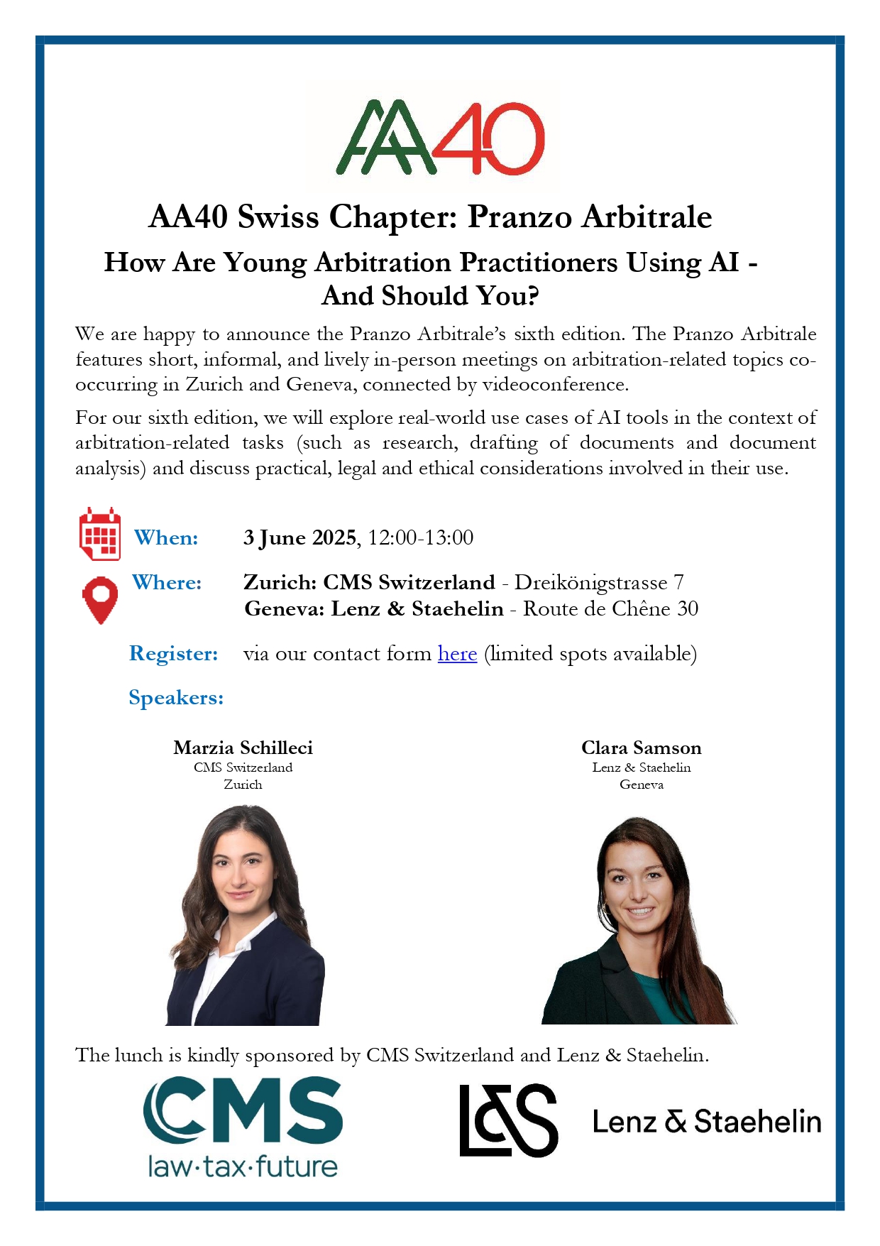 The Swiss Chapter of AA40 invites you to the sixth edition of the Pranzo Arbitrale, taking place on Tuesday, 3 June 2025, between 12 and 1 pm. It will be hosted by CMS Switzerland in Zurich and Lenz & Staehelin in Geneva.