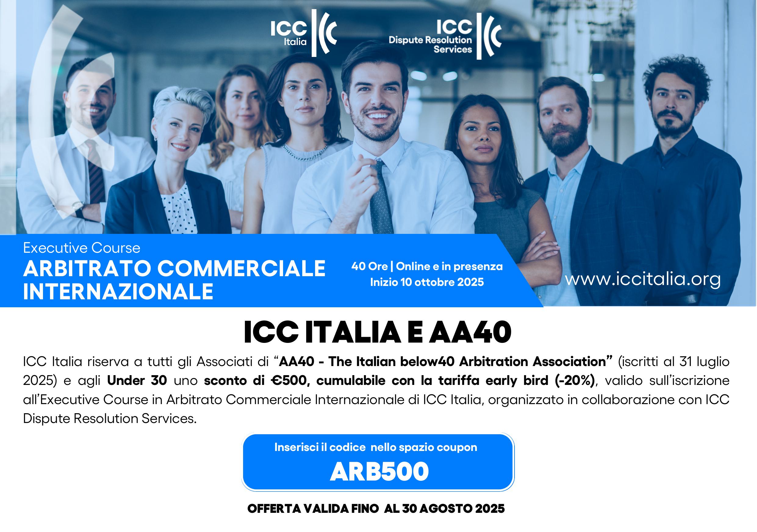 #AA40 has partnered with ICC Italia to offer a special discount to its members as of 31 July 2025 for the upcoming ICC Executive Course on International Commercial Arbitration, an advanced training program designed to deepen both theoretical and practical knowledge in the field of international commercial arbitration, with a particular focus on ICC procedures.