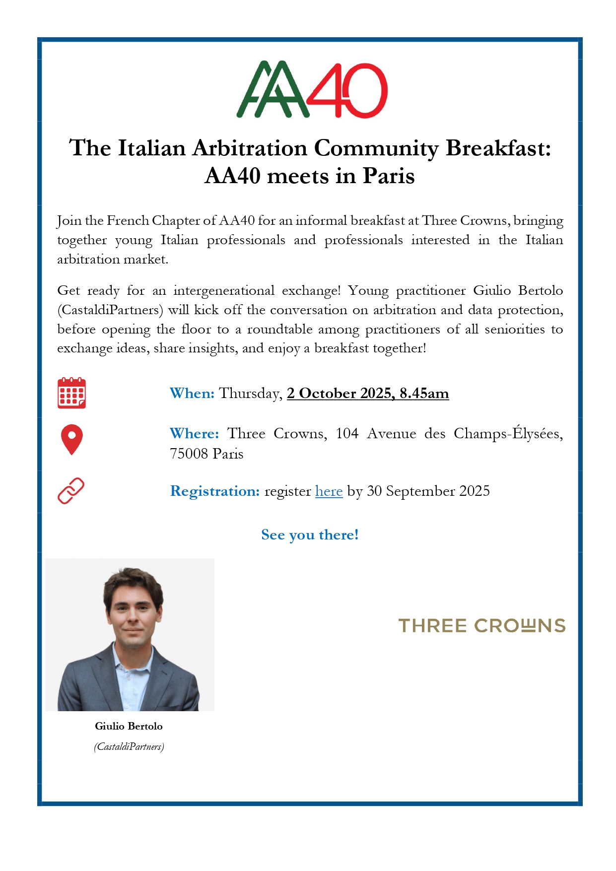After a restful summer break, our international chapters are back with a calendar full of events! We invite you to join the French Chapter for its upcoming one: meet peers and exchange ideas on arbitration and data protection while enjoying an informal networking breakfast at Three Crowns LLP!