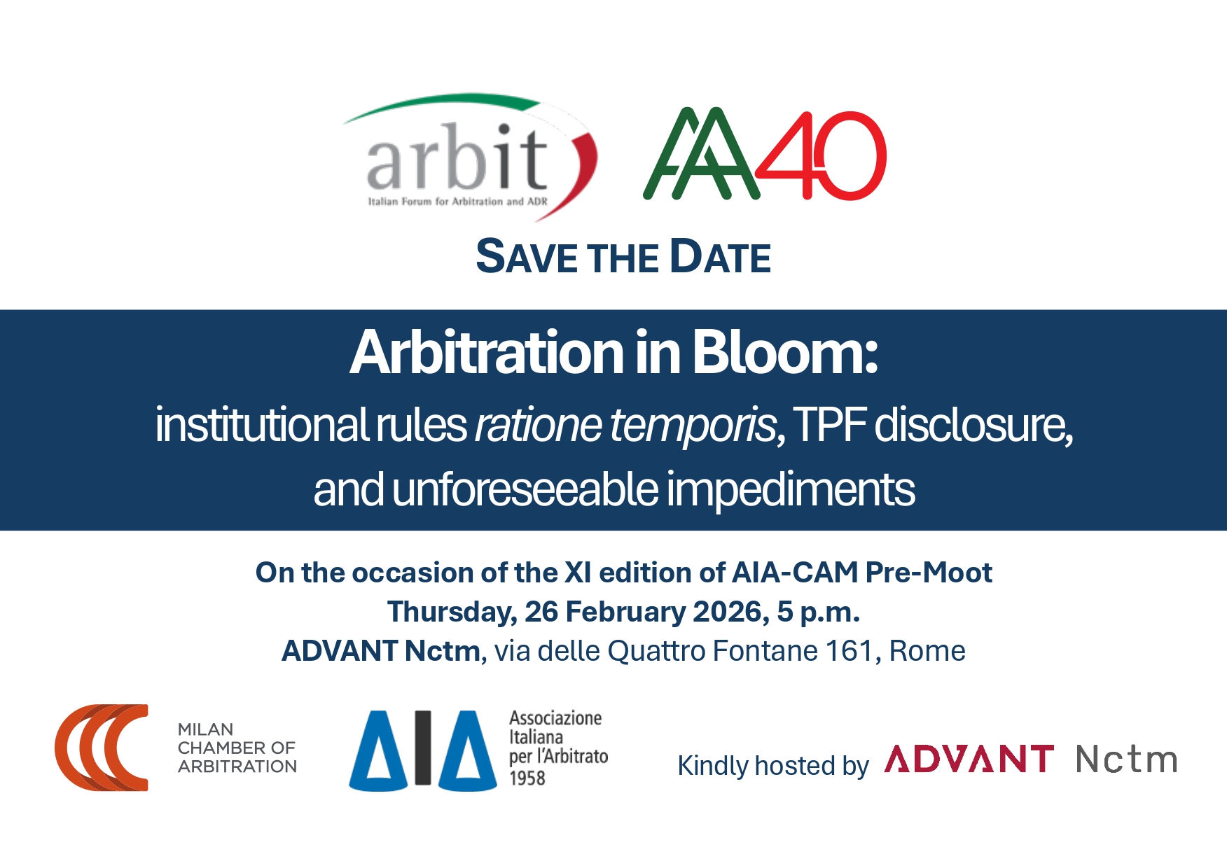 On the occasion of the official opening of the XI edition of the AIA-CAM Pre-Moot, AA40 – The Italian below40 Arbitration Association and ArbIt Italian Forum for Arbitration and ADR will jointly organise a conference titled: