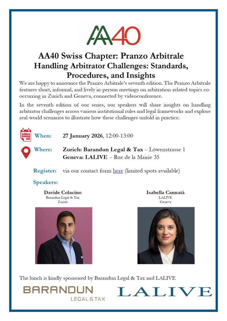 The Swiss Chapter of AA40 invites you to the seventh edition of the #Pranzo#Arbitrale, bringing together young arbitration practitioners across Switzerland.